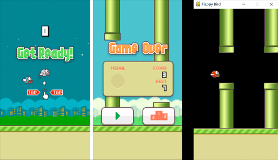本案例将完成如下游戏场景:障碍物以一定速度往左前行,小鸟拍打翅膀向上或向下飞翔来避开障碍物,如果碰