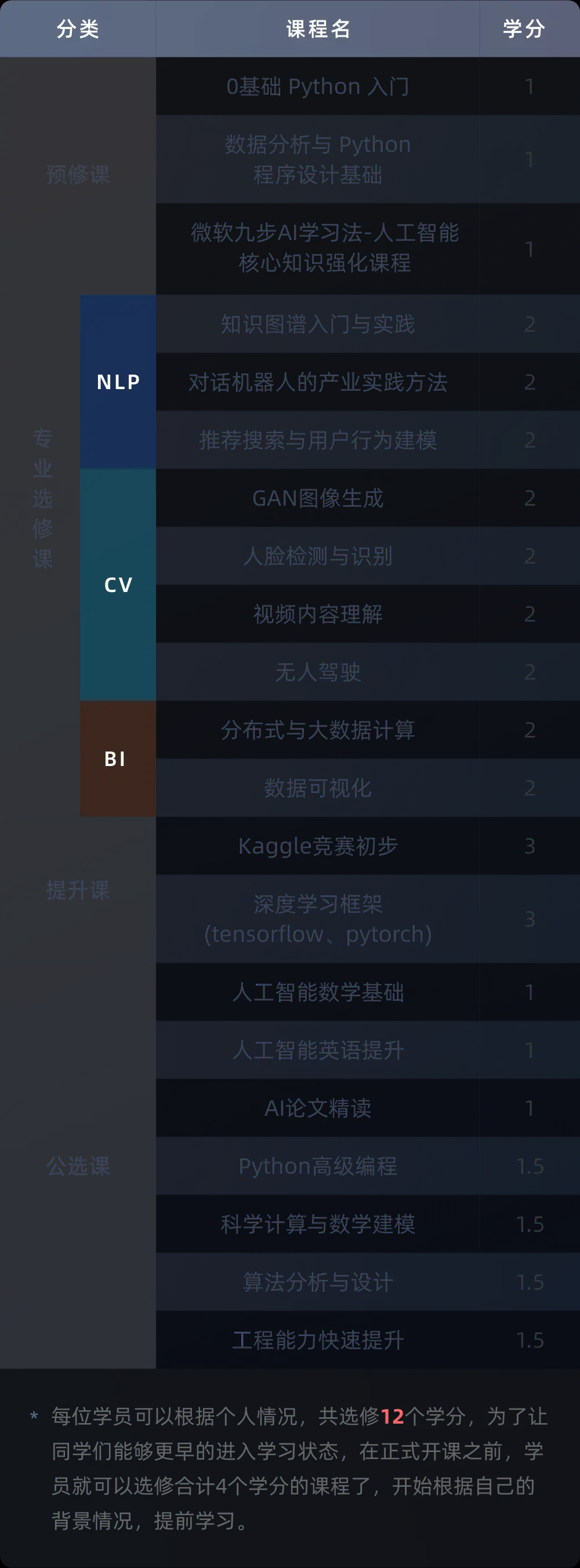 为了满足不同基础的学生需求,我们提供了预修课、专业选修课(分专业选修)、公选课、提升课。预修课和公选课帮助学员具备人工智能中的数学、英语、python编程、算法分析、数据分析的基础。