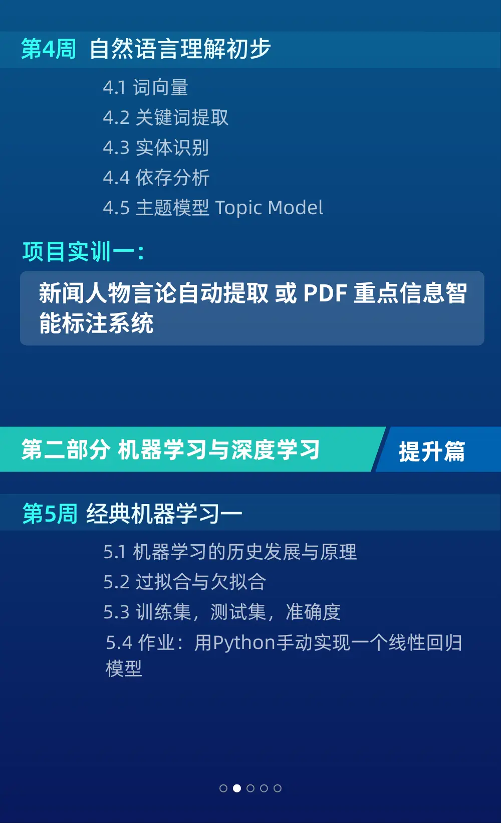 课程主要内容涉及计算机编程思维的养成,数据分析、数据科学的深度理解和实践;机器学习(ML)、深度学习(DL)的深度理解和实践;计算机视觉(CV)、自然语言处理(NLP)、推荐系统(RS),数据挖掘(DM)、数据科学(DS)等方向,培养同学们解决典型问题的能力。