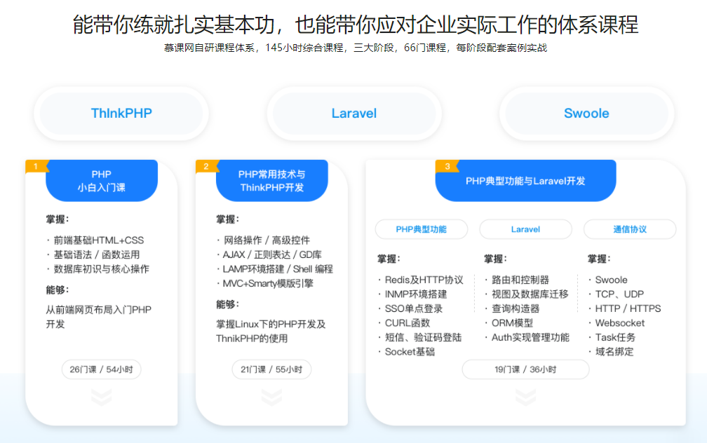 - 想要学好Web后端开发的中流砥柱语言,本阶段为你轻松铺就扎实的基础,从前端网页布局的搭建到后台PHP开发,助你从零基础到掌握主流开发语言。