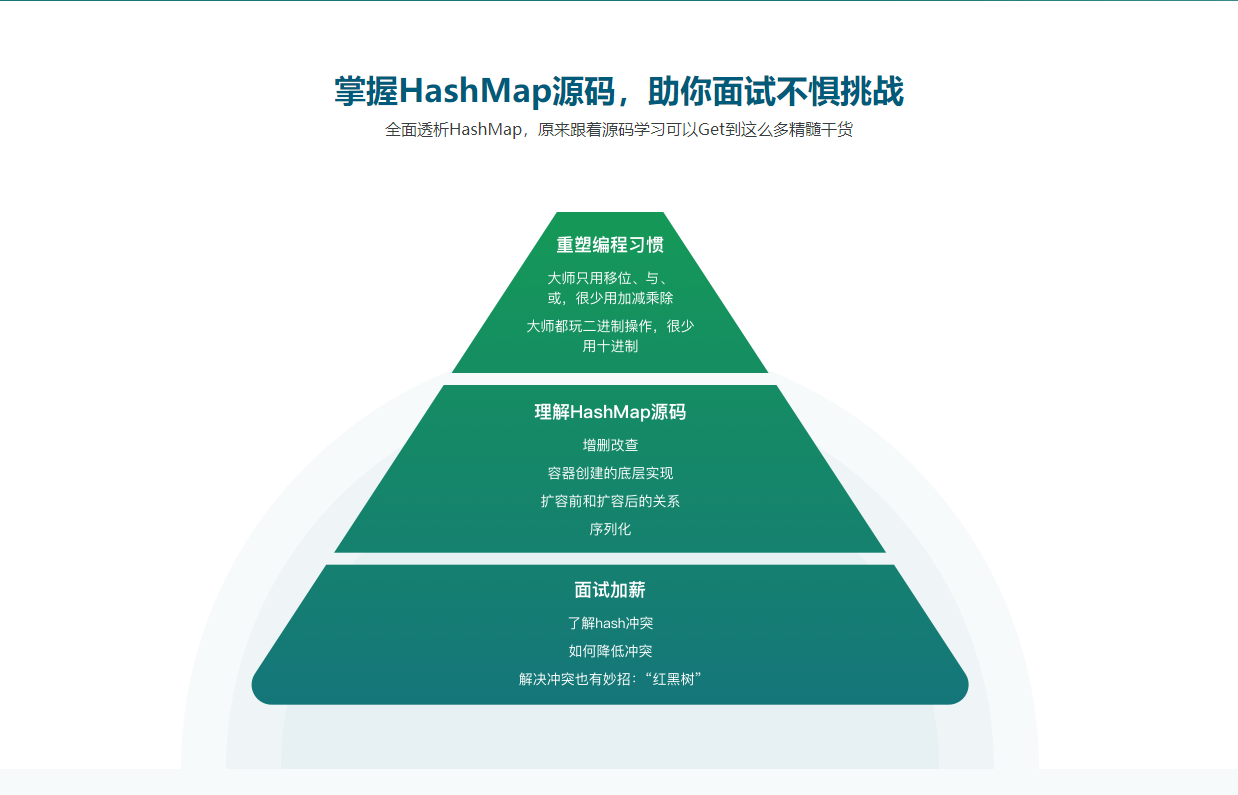 介绍大纲、重点、目标和收获。三部分:面试加薪点、剖析HashMap源码、重塑编程习惯。首先【面试加薪点】hash冲突,降低冲突,解决冲突妙招:“红黑树”。其次【剖析源码】:增删改查、扩容、序列化。最后重塑编程习惯:位运算与二进制才是内功。…