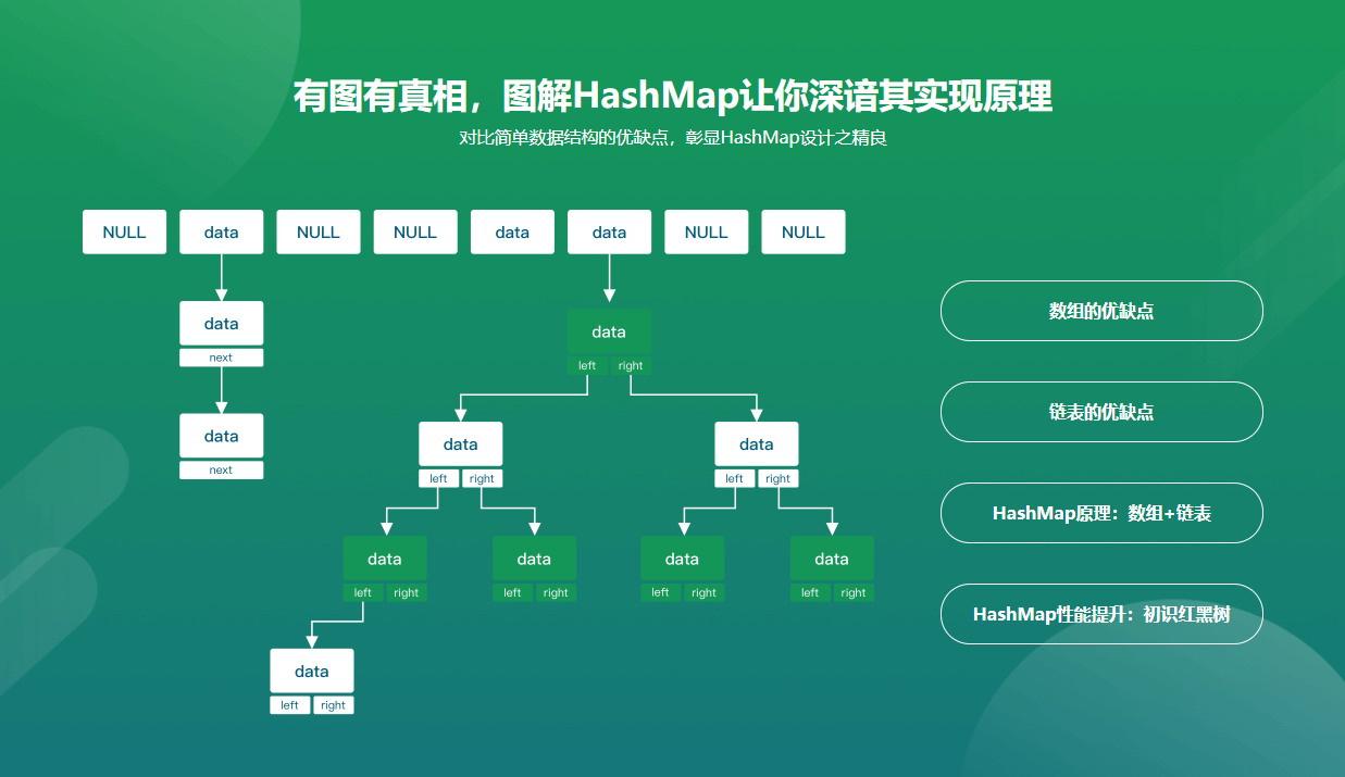 再复杂的问题背后也都是由简单的问题组成的,本章节通过图示了解各数据结构的优缺点,然后将其组合成我们课程的主题-HashMap,可以直观的了解到HashMap的实现原理,最后掌握面试常考,工作常用的HashMap冲突解决办法。