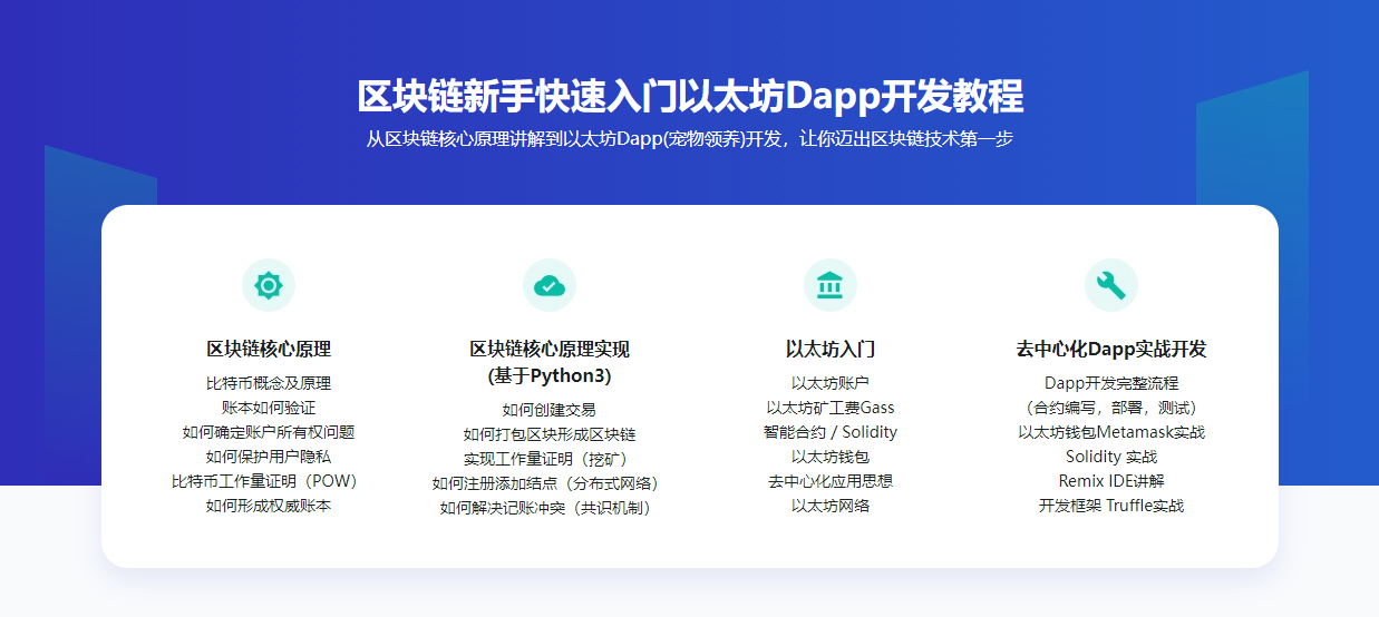 本课程将详细为你讲解区块链核心概念与原理,让你快速入门区块链技术;然后基于Python3实现区块链核心原理,加深你对区块链原理的理解;最后带你基于以太坊开发一款去中心化Dapp,让你掌握Dapp开发的整套流程与思想。