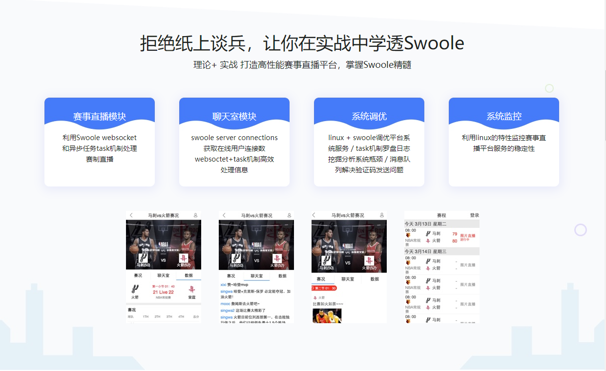 本章我们会实现赛事节目列表页面; 赛事直播页 赛事数据页;在赛事直播的页面中由于客户端和服务器端必须是要保持一个长久的连接,这样后端有新的直播数据的时候页面才能实时的呈现,这个地方我们用到的就是swoole里面websocket并且还会结合异步task任务来处理响应的内容,赛事的内容我们支持图片+文字;课程中还会讲解开…