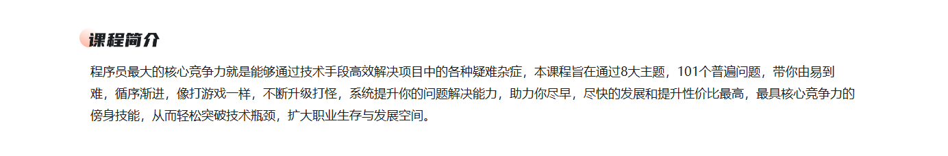 程序员最大的核心竞争力就是能够通过技术手段高效解决项目中的各种疑难杂症,本课程旨在通过8大主题,101个普遍问题,带你由易到难,循序渐进,像打游戏一样,不断升级打怪,系统提升你的问题解决能力,助力你尽早,尽快的发展和提升性价比最高,最具核心竞争力的傍身技能,从而轻松突破技术瓶颈,扩大职业生存与发展空间。