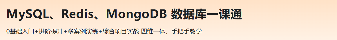 MySQL Redis MongoDB 数据库一课通视频教程。本课程带你从0基础入门,稳步进阶,掌握数据库核心技能,多案例实操帮你提升数据库应用能力,MySQL、Redis、MongoDB 三大数据库综合项目实战,还原企业开发多数据库应用场景,落地综合实战能力。三大主流数据库,一课搞定!