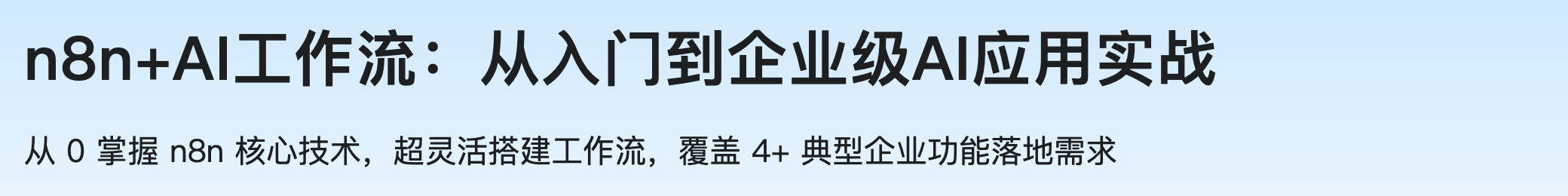 n8n+AI自动化是目前企业提效最佳选择,本课从基础入手,逐步深入,带您掌握:部署、流程控制、大模型集成、LangChain智能流搭建、RAG知识引擎开发等n8n核心技术。积累4+多场景企业级实战经验(日报机器人、销售协同系统、自动分发邮件系统、RAG知识库 );具备“自动化 + AI”解决方案设计能力,全方位提升企业AI自动化、灵活搭建工作流综合实战能力,成长为市场紧缺的AI工作流人才,先人一步吃到n8n工作流红利。