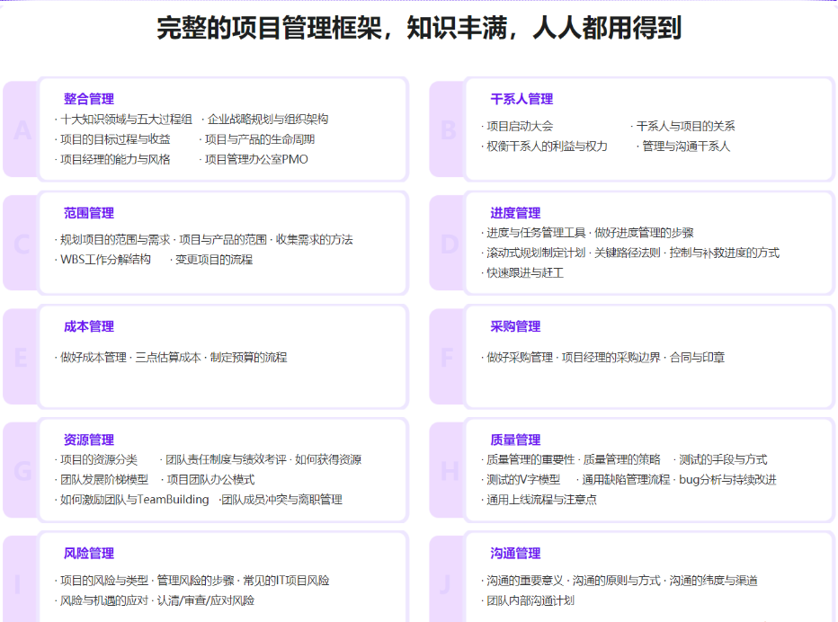 人人都要学的项目管理课能为我们程序员提供哪些帮助?可以对整体项目管理有更强的认知,假如了解过,经历过理念,那么针对中后期转型发展会更好,并且如今企业里对35年龄段卡的很死,一定要事先做好充分的准备。由于这个不是到了35才考虑的,而是事先规划事先布局。每个人都要学的项目管理课程将带你系统化学习项目管理,使你无论做开发或是转PM,都能得心应手! 人人都要学的项目管理课程带你掌握系统的项目管理方法,提升管理能力,扩宽职业选择空间。本课程包含完整的项目管理框架,专业知识丰满,人人都用获得,并且紧密结合开发项目开发流程,让开发人员学了就能用。