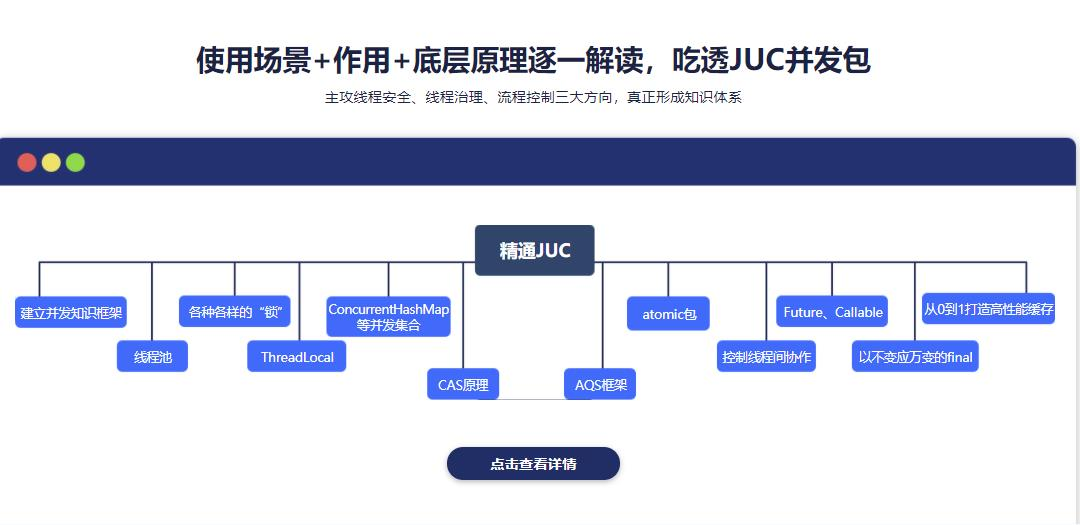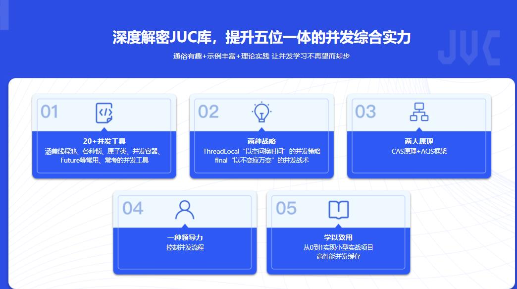 本课程深度解密JUC库,对Java并发常见的工具类进行从使用到原理的详解,包括CAS+AQS+ThreadLocal+ConcurrentHashMap+线程池+各种锁+并发综合实战项目等。在掌握工具的同时,建立起整个并发工具类的知识体系。