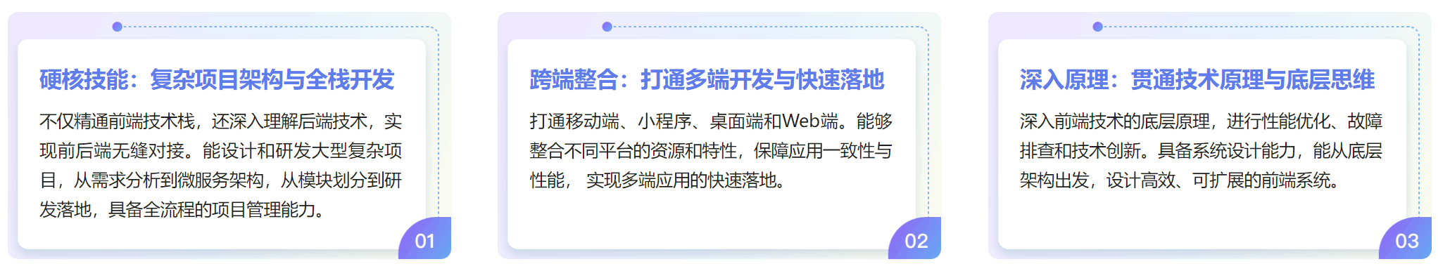 全方位打造“技术成长&职业破局”双高体系,深度打通“全栈 + 全流程 +多端+ 工程化+AI赋能”,全面培养“驾驭全局,深广兼备,打通多端全栈”的高级工程。
