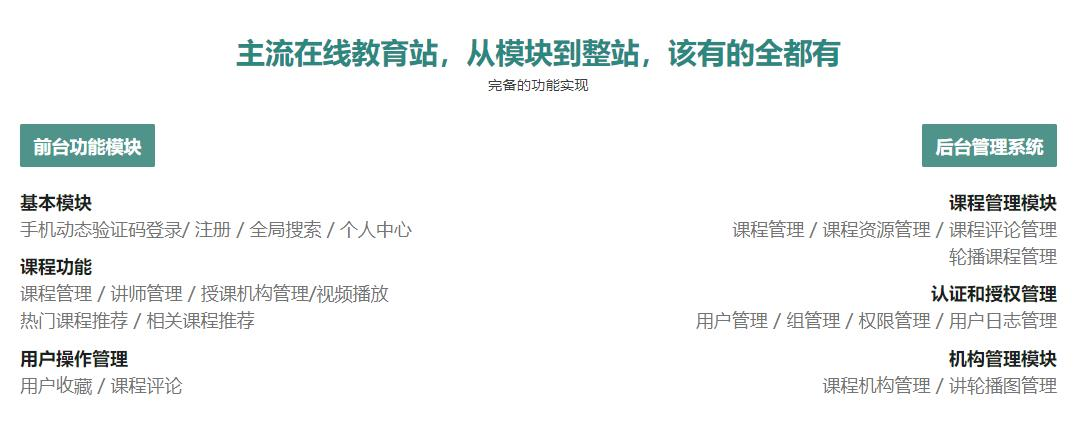完成课程相关功能模块开发, 包括课程列表功能实现、课程详情页展示、 课程评论功能和相关课程推荐等功能实现
