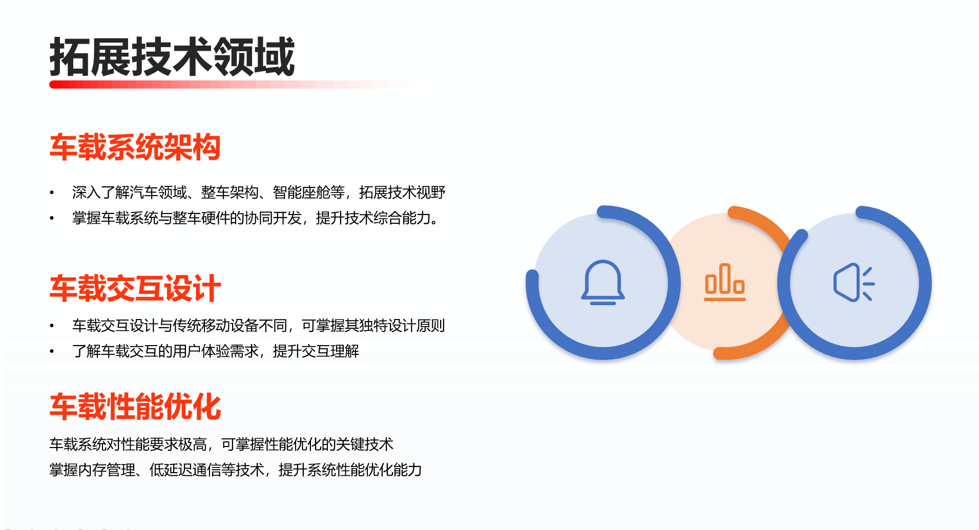 本课程通过手把手教学车载投屏、车载多媒体、智能语音等三大核心功能开发,帮你系统掌握车载 Android 架构、车载App迭代方式、复杂多进程媒体管理等关键技术,并驾驭智能座舱项目全流程。同时学会将互联网开发经验迁移至车载场景,解决跨领域适配难题。最终实现不切换技术栈,低成本转入火爆的新能源车载领域,快速构建车载开发技术护城河,实现职业赛道突破。