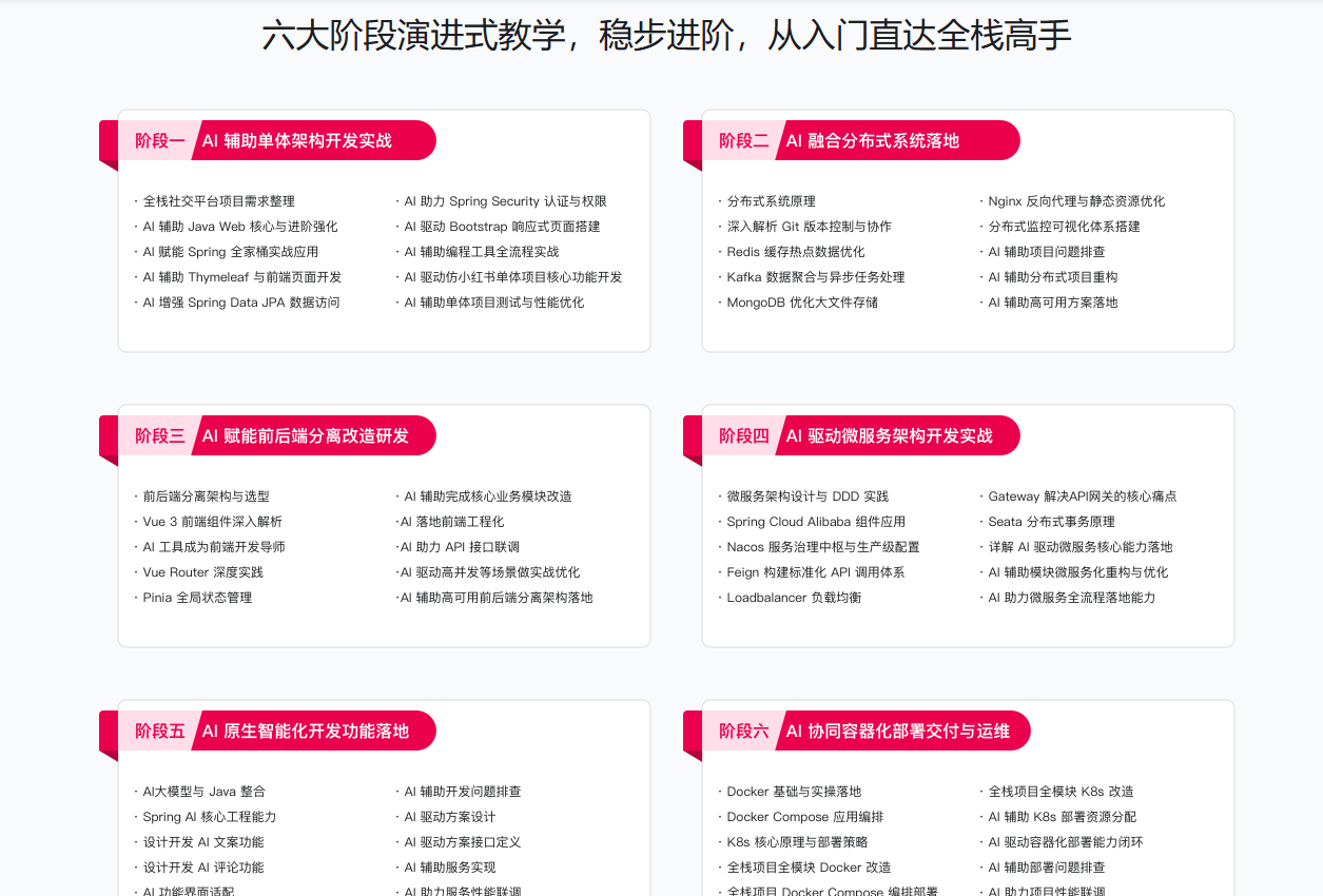 Java+AI全栈开发工程师视频教程。本课程打通“单体→分布式→微服务”架构演进路径,全面覆盖后端、前端及AI原生开发场景。以AI全程驱动,带你轻松驾驭“综合实战→业务分析→数据应用→架构设计→工程落地”全流程。手把手教学,低门槛入门,助你平滑进阶为独当一面的新生代高薪开发人才!
