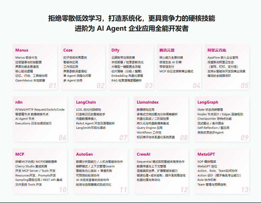 本课程系统覆盖AI Agent主流工具与框架,包含Manus、Dify、Coze、n8n、腾讯元器等低代码平台,以及LangChain、LangGraph、LlamaIndex、CrewAI、MetaGPT、AutoGen等开发框架。课程结合100+实操案例与4大综合实战项目,带你从简单到复杂,从入门到进阶,系统构建从单智能体到多智能体开发硬核实战技术与企业落地能力,助力你快速成为企业刚需的AI智能体实战人才。