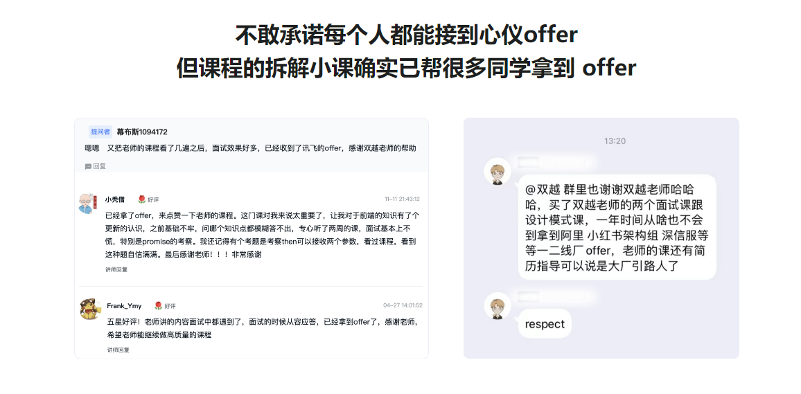 双越老师从 2017 年开始制作前端面试课,经过 5 年的经验积累,终于完成了这套体系化、全流程的前端面试解决方案。本课程包含了从知识点、考题、到刷题,从简历编写、简历分析、到模拟面试的多维度知识与经验技能,助你更从容地应对大厂的前端面试。