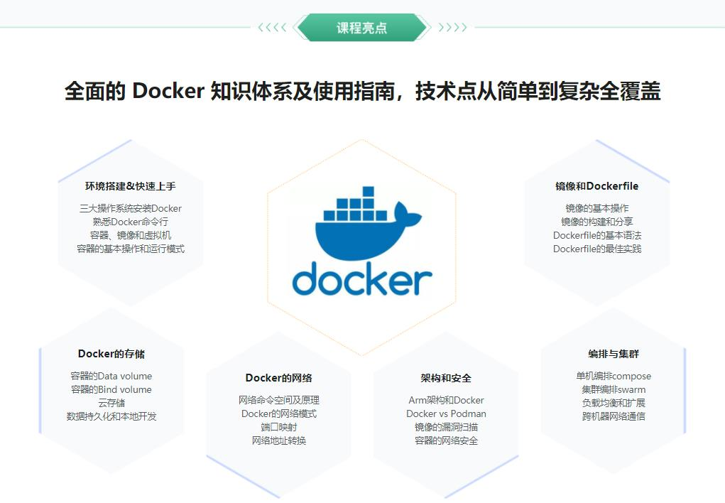 近年来,容器技术在互联网行业大火,特别是在开发和运维方向,极大地解决了规模化和灵活化部署的问题。作为容器技术的代表作 Docker 更是被广泛应用,本课程将带大家系统学习 Docker,从什么是容器,创建管理容器,到容器技术的各个细节(网络 / 存储 / 服务编排 / 监控),再到通过容器进行 CI/CD 持续集成,持续部署,彻底掌握容器技术。