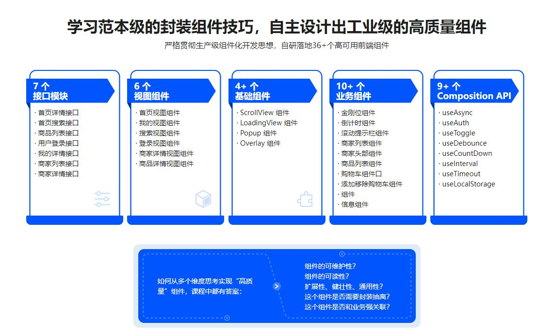 - 第8章 商品列表组件开发内容更新中本章将带领大家从 0 到 1 实现一个滚动视图组件,涉及如何设计一些类库的思想和方法,包括常见的设计模式,比如工厂模式、代理模式、组合模式、责任链模式、发布订阅模式等,让你对类库的封装有更深一层的认识。