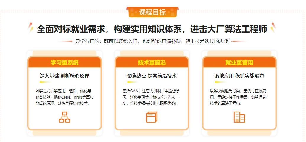 想要成为一名优秀的深度学习工程师并不容易,一看就会,一用就废,已然成为很多人进军AI 领域的心魔,自以为理解了框架、算法,但遇到实际问题却仍不知道该怎么解决。本门课程将结合核心基础、算法模型设计和实用案例,由浅至深、由理论到实操,带你紧跟行业热点,系统入门深度学习,掌握解决实际问题的能力,轻松畅游AI时代!