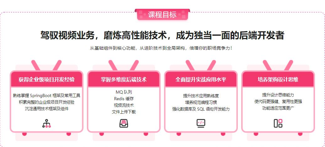 如今短视频成为了风口中的风口,但市场上极度缺乏视频业务开发的相关技术人才。本课程基于SpringCloud微服务架构+Springboot+JDK+Maven等技术,实现B站核心功能(视频流、弹幕流)+百万量级的高性能优化,让你在实战中全面提升技术水平,掌握架构设计思维及丰富解决方案,从此拥有高性能+视频业务项目经验的背书!