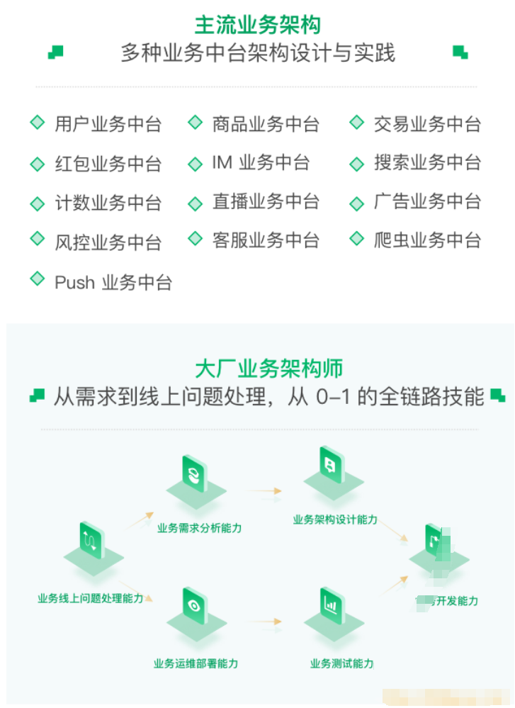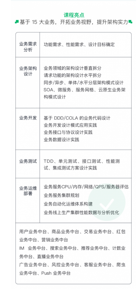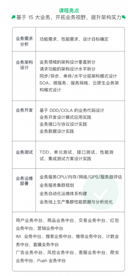 • 会围绕着百亿级电商平台进行讲解,课程里面会把整个电商拆为用户中心、商品中心、风控中心、活动中心等 15 个中心,对这些中心进行业务拆解、业务抽象;并灵活使用该课程中的知识点,帮助学员成为专业的业务架构师。