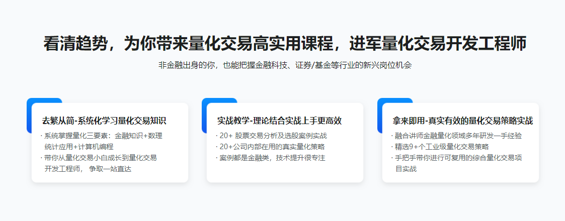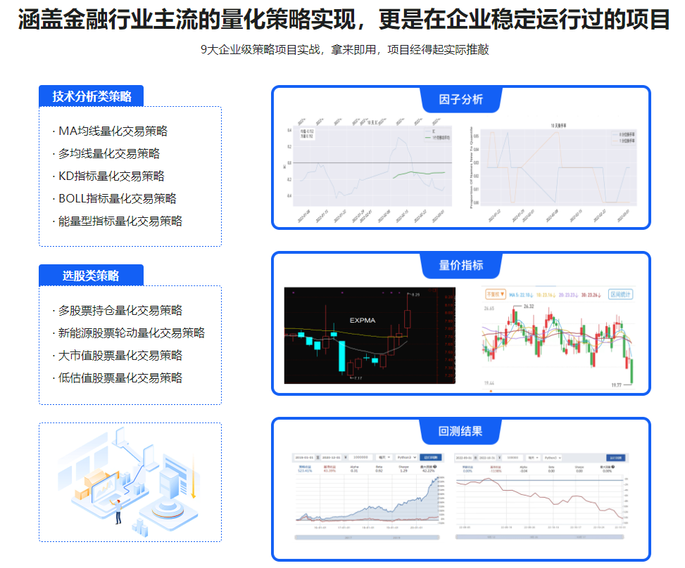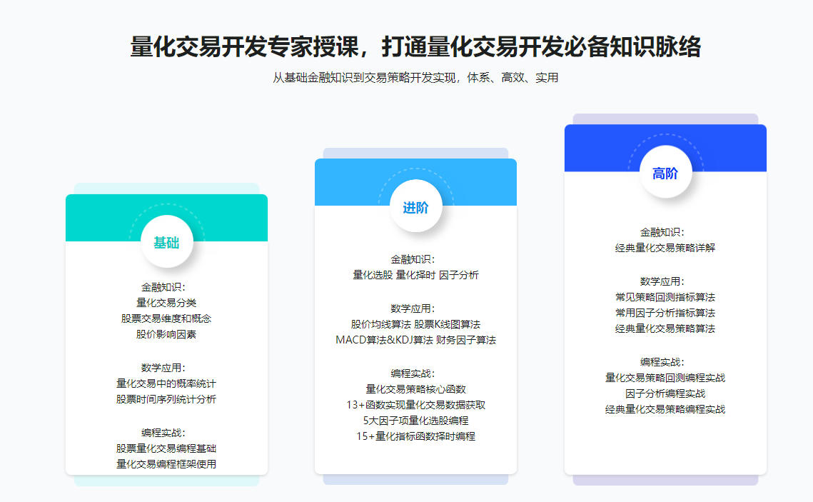 - 课程将深入浅出讲解股票量化交易策略原理与代码实现,详细讲解股票量化交易涉及的金融知识、数学应用以及编程技巧,并实现真实有效的量化交易策略案例。大家学完本课程后,可基本掌握量化交易所涉及的金融知识、数学知识以及计算机编程知识,达到量化交易开发工程师水平,可独立开发量化交易策略