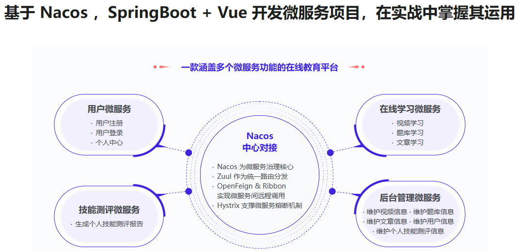 本章实战视频学习、题库学习、文章学习三大在线学习功能,实现视频、文章和题库的在线学习、记录学习时长,以及题库开发、成绩查询等功能,实现在线学习微服务与 Nacos 微服务治理中心对接。