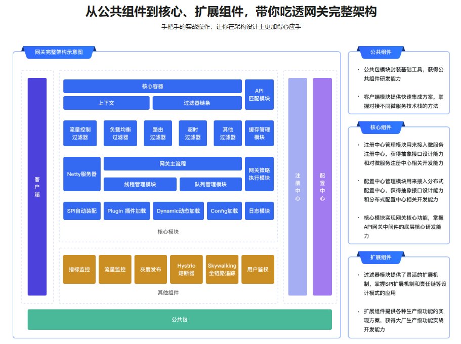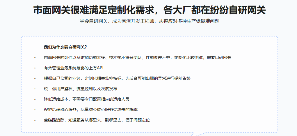 大部分一线开发人员自研开发能力都比较薄弱,导致难进大厂或晋升受阻,进而阻碍了个人的职业发展。为此,慕课网重磅推出自研网关课程,课程将带你系统掌握自研网关的完整流程,并手把手实践与落地整套方法论,助力你成为自研组件高手,过程中综合运用“三高”主流技术栈,全面提升高阶技能,突破职业发展瓶颈。
