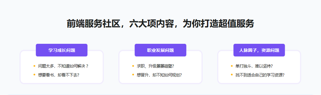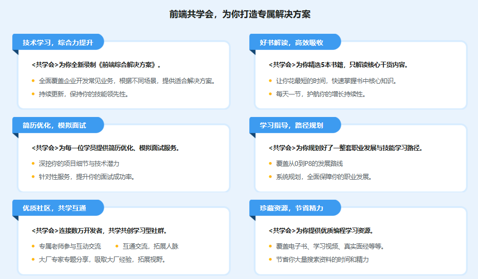 如果你当前比较迷茫和焦虑,不知道学什么课,读什么书,简历怎么修改,如何通过面试,如何规划学习路线持续提升技术,工作难题无人指导,职业瓶颈难以突破,也没有一个高质量的互助圈子,那么《前端共学会》都会给你提供答案。