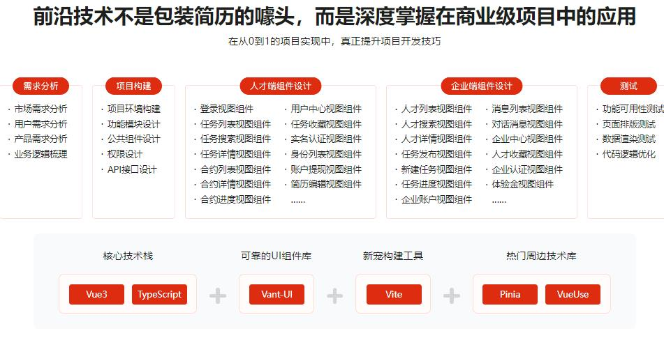 这是非常有价值的一门项目开发课程,对于初入职场的开发者,将助力面试时极大提升个人竞争力,展露能力价值。课程以业务驱动技术栈,将真正的商用级项目复原在课程中,使用Vite、Vue3、Vant3UI、Pinia和VueUse等前沿技术,从构建、研发、测试,完成整个全流程的学习。让你在掌握技术的同时,也能提升作为开发者的综合素养。项目功能相对完善,界面美观,手把手带你做出亮眼的作品。