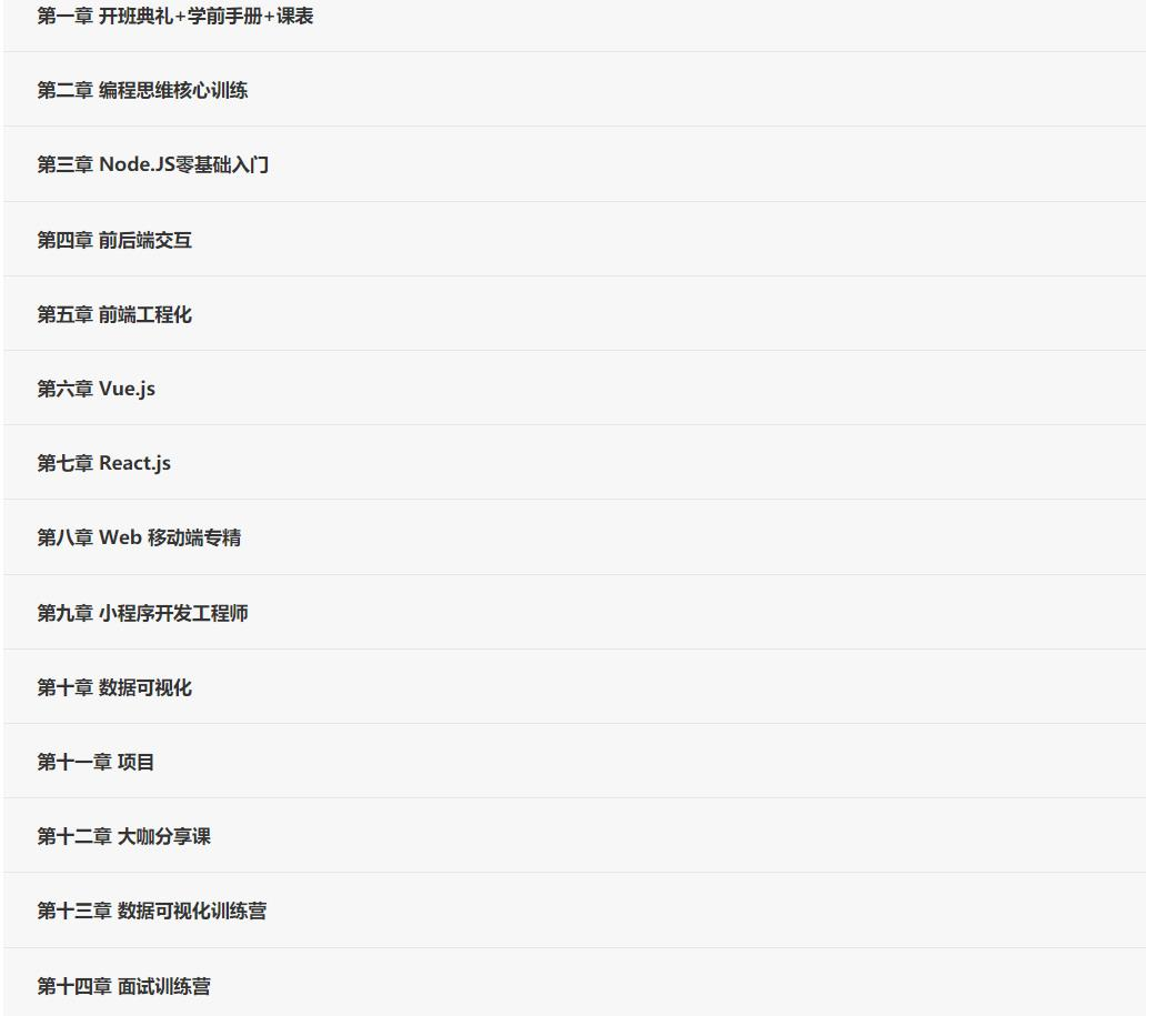 此课程的特点是全面覆盖当下前端开发各项技术栈前端;紧跟时代的潮流做前端的弄潮儿;以实战为课程驱动:Nodo实战-《后台管理系统》、react实战-《CNode》、移动端实战-《React Hooks 搭建移动端企业站》、Vue 实战-《美食电商系统》;跨平台覆盖;PC端、移动端、后端、小程序统统搞定,名师亲自授课+百度高T大牛技术支持,总之是走向大前端的必然之选。