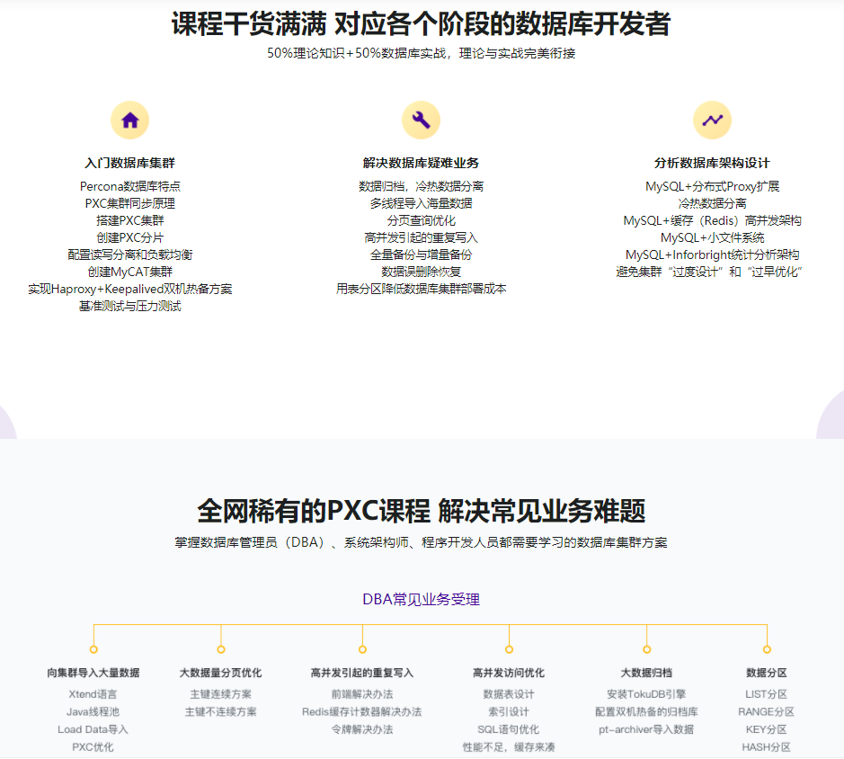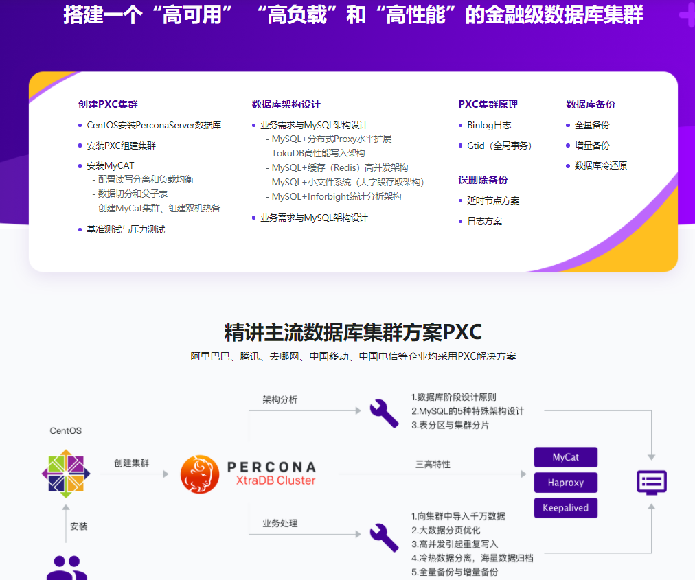 本课程将在Linux环境下,带大家学会建立三高特点的PXC集群。此外,还会学习用PXC集群解决数据库范畴的一些疑难问题,比如说冷热数据别离、大数据归档、海量数据导入等等,并带领大家领悟数据库架构设计的诸多计划。