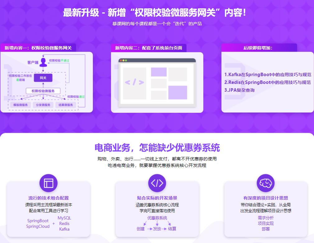 课程手把手带你实战搭建优惠券系统,基于主流的微服务开发框架SpringCloud,结合MySQLRedis、Kafka,通过优惠劵模板、分发和结算三个微服务完成电商优惠券系统核心业务,是小伙伴们毕设、加薪、跳槽、转型的必备利器。