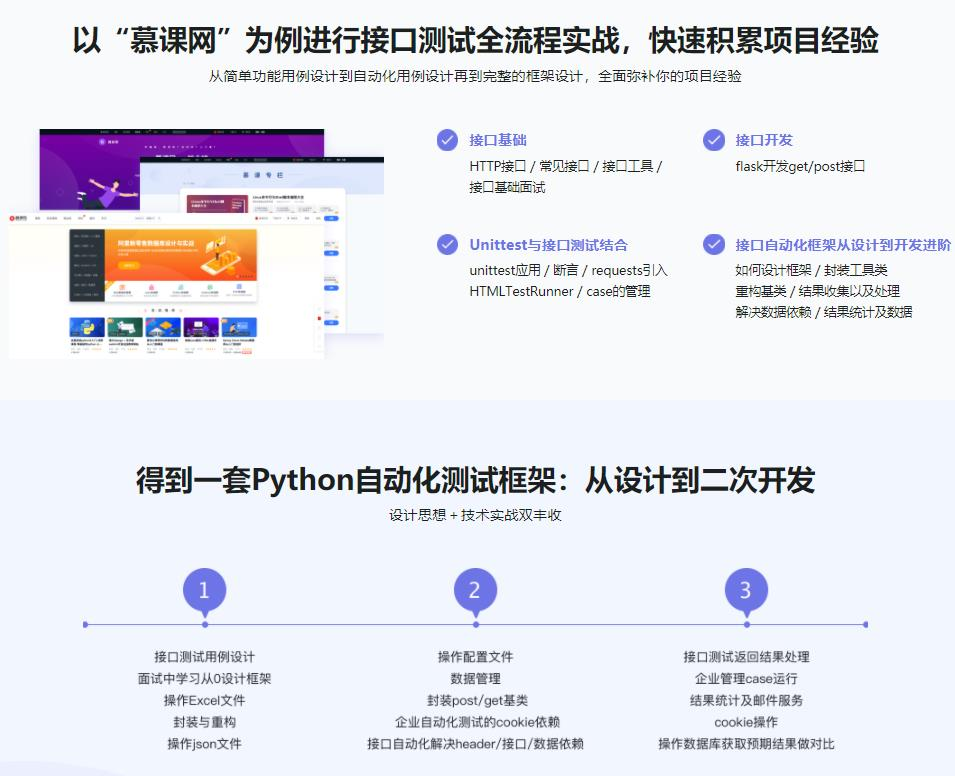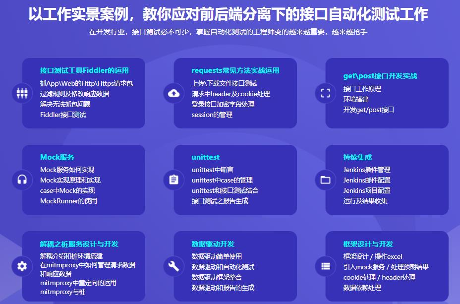 课程从接口基础知识讲起,覆盖:抓包+接口工具的运用+常见接口库+接口开发+Mock服务+unittest框架的运用+接口测试框架的设计、开发+持续集成, 最后开发一套前后端解耦过程中需要用到的桩服务来完成我们整个接口自动化测试框架的学习。