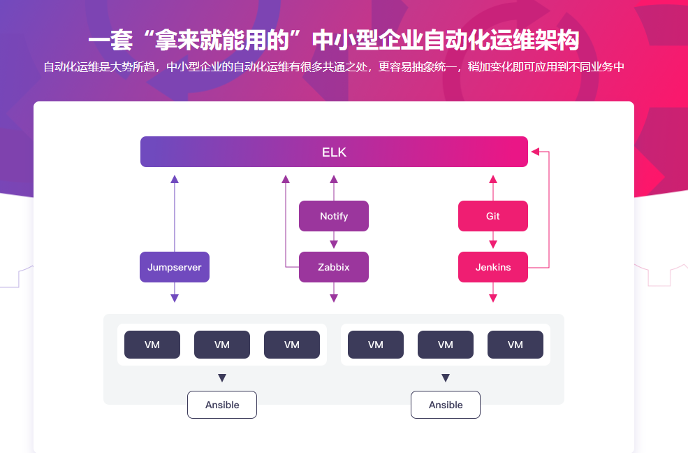 • 主要讲解了自动化运维的概念,分析了现在的自动化运维的面临的挑战。基于我对自动运维的理解,提出了中小企业自动化运维架构,并讲解了该架构。后续的章节,主要是实现这个架构。