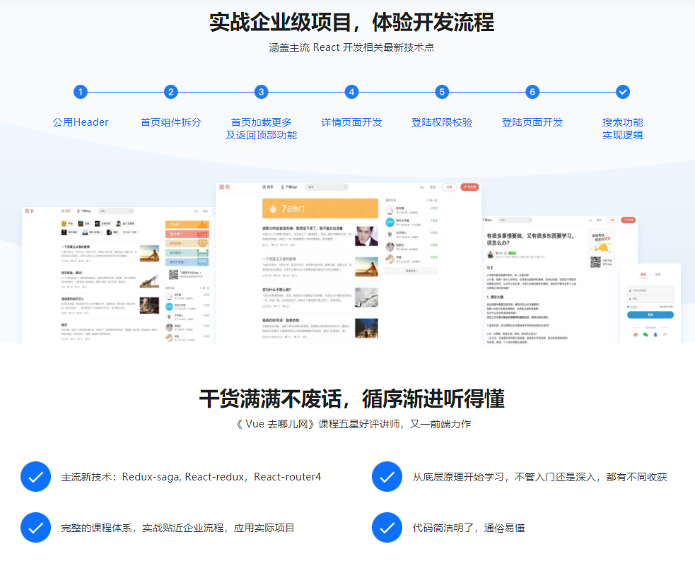 本章将带我们完结项目主页的开发,课程能容包括react-router4的运用,组件及reducer的拆分规划,主页部分的核心功用包括列表显示,加载更多,返回顶部等。