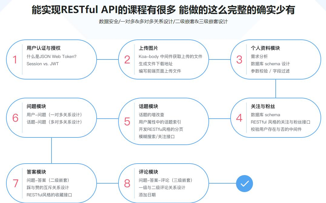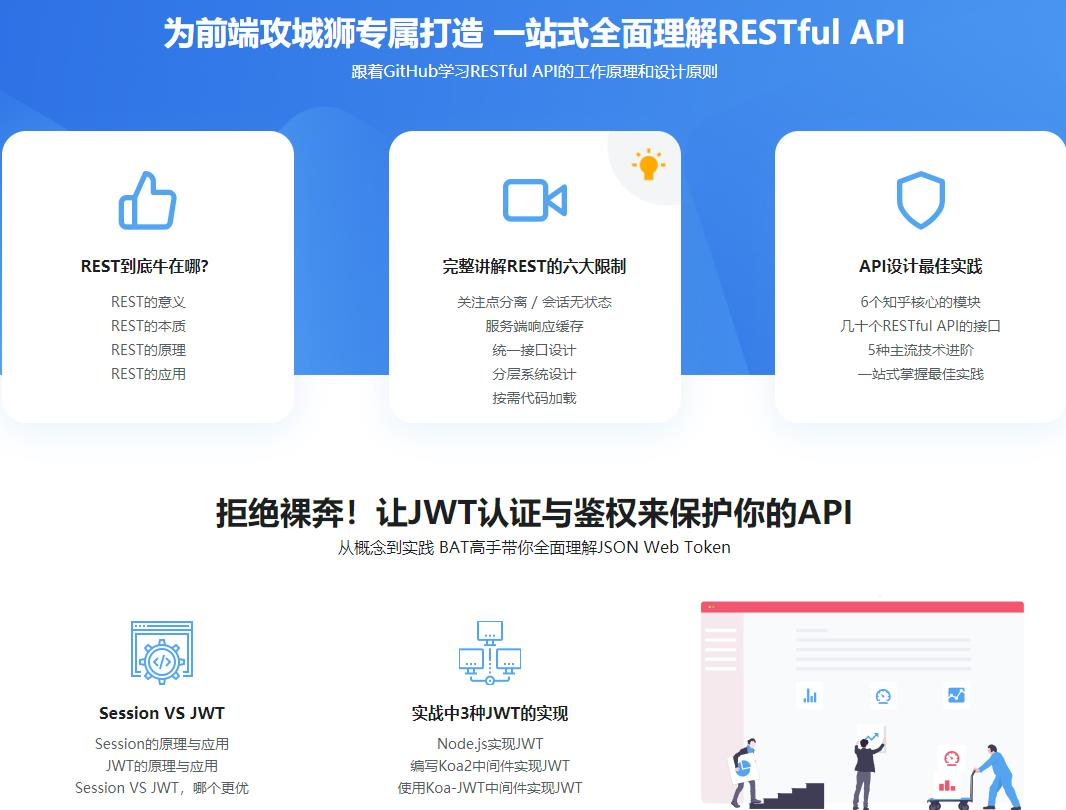 本课程通过开发知识社区平台网站的服务端核心模块,带你步步深入的理解 RESTful API的概念和设计原则,同时讲解了Koa2 、MongoDB、JWT 等一线开发技术,实现从Hello World,到完成线上部署的开发全过程。