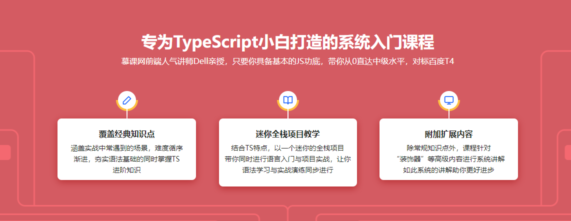 TS在构建大型应用上的优势,以及与JS的完美互通,让TS未来一片光明,在慕课网人气讲师dell老师带你从0到1系统学习,把TS真正应用到框架和项目中,在框架中学,在项目中学,在老师指导中学!