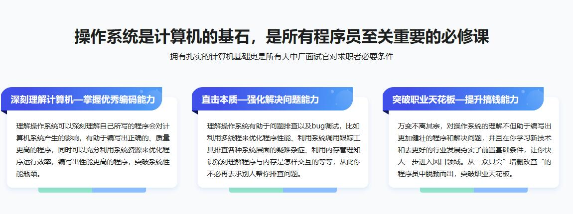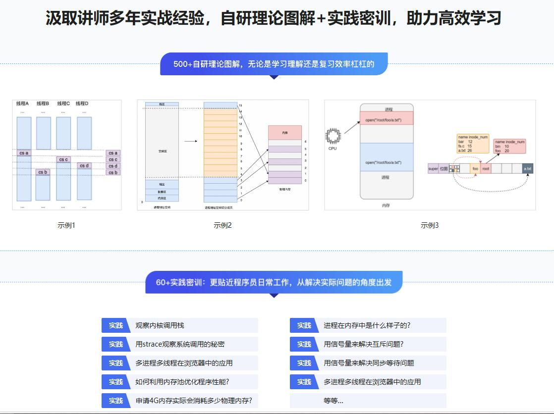 操作系统是计算机的基石,理解操作系统有助于写出正确的、性能更好、稳定性更高的程序,是技术各路大厂面试官重点考察的能力之一,成为越来越多程序员的必修课,鉴于此,课程从知识点之间的联系出发,研发出一条循序渐进,不断层的学习路线,并汲取讲师多年实战经验自研理论图解和密训案例,带你从0到1参透技术本质,快速补齐操作系统短板,来一次质的提升。