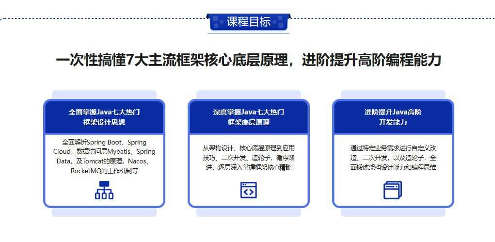 提升编程水平的最佳方式就是多阅读优秀的框架源码。本课程专门为你汇聚了Java Web开发主流热门框架(Spring Framework , Spring Data, Spring Boot, Spring Cloud,Mybatis,Tomcat,RocketMQ),从框架的架构设计、核心源码解析 到二次开发,造轮子,面试指导,循序渐进的让你更全面的掌握框架底层原理,提升框架应用技巧、和造轮子等高阶能力。