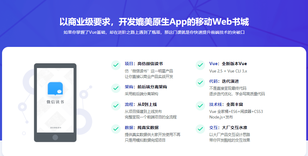 运用Vue开发一个可商用、功能完备的Web阅读应用。在开发中,将各种知识点穿插应用,让你真实感受到一个明星产品开发的全过程。同时,项目提供一流的用户体验和交互水准,在实现功能之外带你探究各种优秀前端交互的设计和实现。