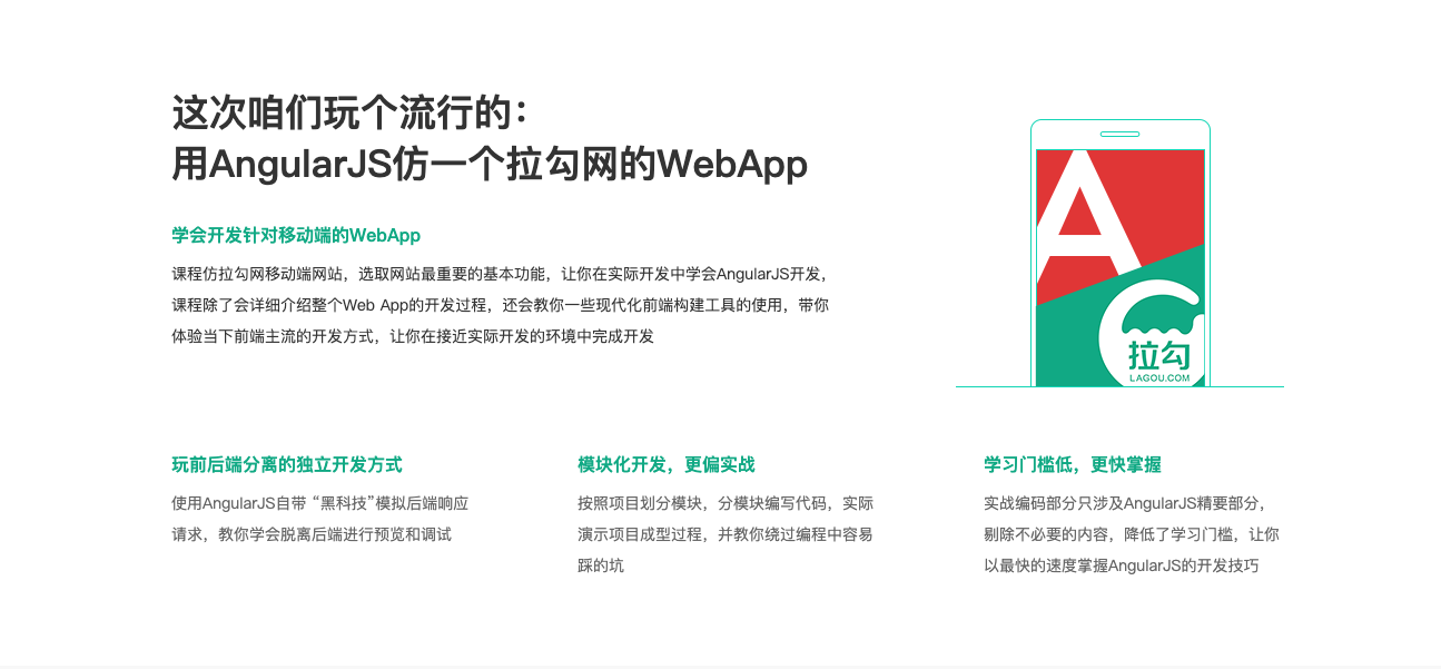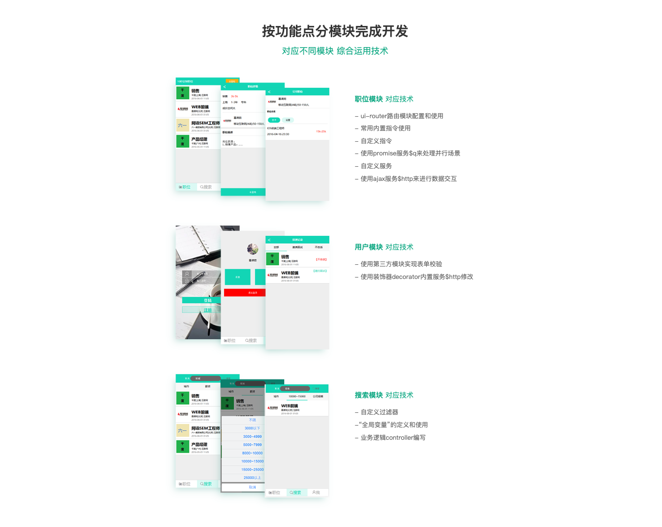 基于AngularJS,仿拉勾网开发一个招聘类的移动端单页应用,包括登录、注册、搜索、查看、收藏等功能,涵盖如指令、数据绑定、过滤器等AngularJS最常用的、难理解的核心概念,通过这一次实际开发,最终让你获得使用AngularJS独立开发单页应用的能力