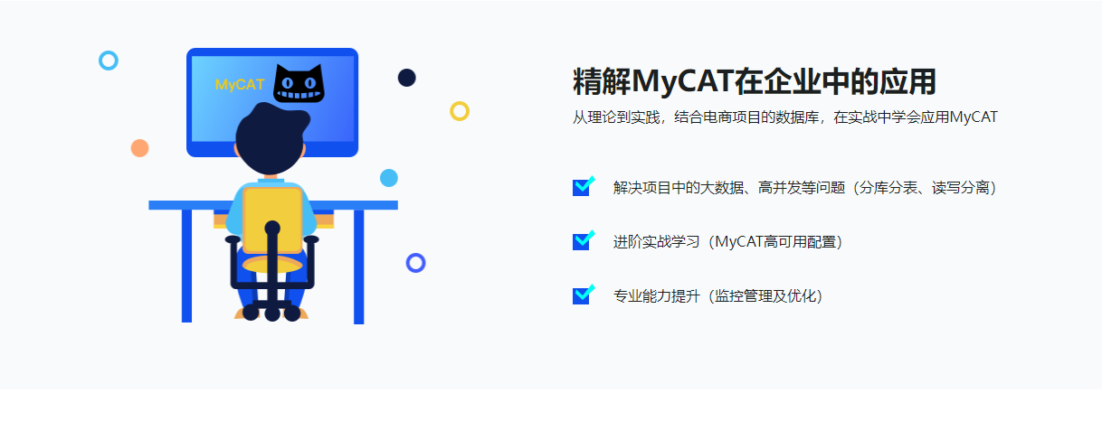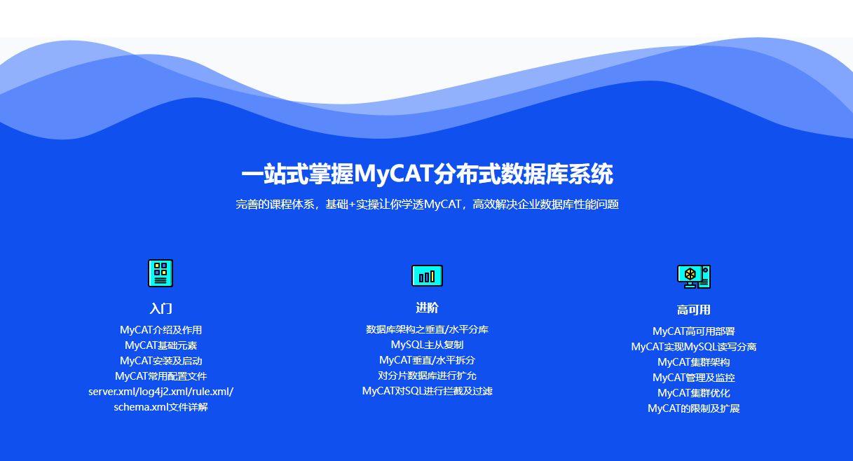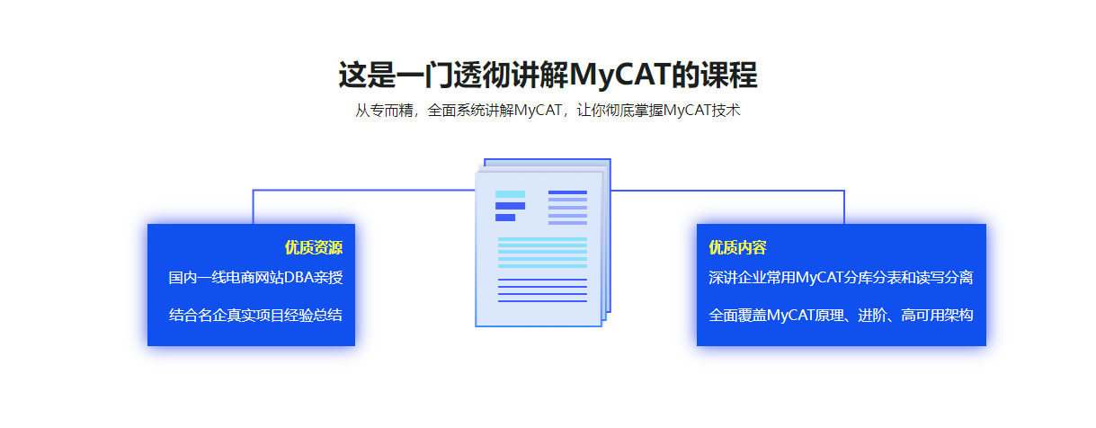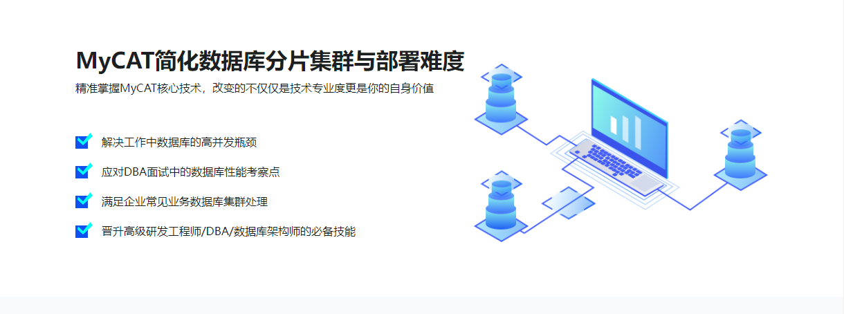 为了提升数据库的性能,本课程围绕MyCAT来实现对业务数据库的分库分表、读写分离,构建一个以MyCAT为核心的数据库集群架构,以企业级方案解决数据库出现的性能问题,做个数据库高手!