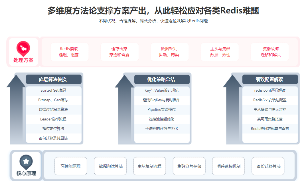 使用Redis轻松应对秒杀、限购等高并发场景,掌握社交中好友与Feed设计开发,利用BitMap完成签到,GEO完成附近的人,同时掌握分布式缓存应用与优化:如何快速写入,缓存淘汰机制,缓存击穿、穿透与雪崩解决方案等