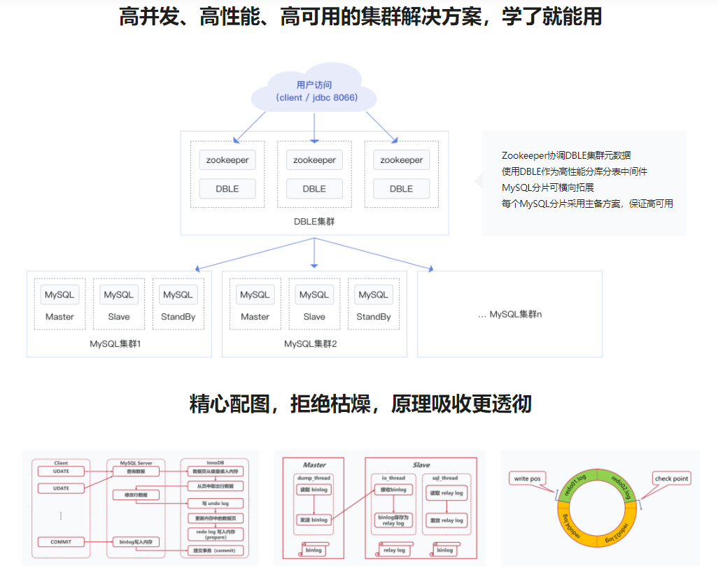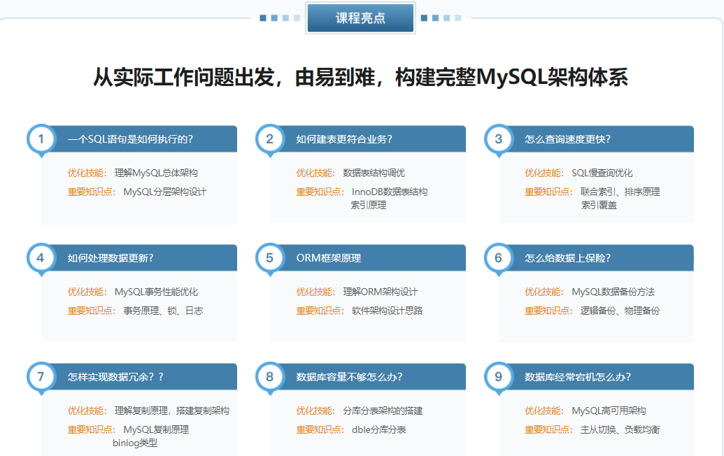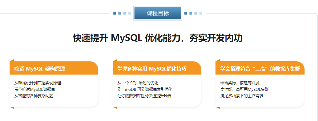 本课程从单点到集群,由浅入深,带大家深入理解MySQL原理,并学会多种不同的MySQL性能优化技巧,最终学会搭建高并发、高性能、高可用MySQL集群,从容应对实际工作中各种复杂的数据库问题。