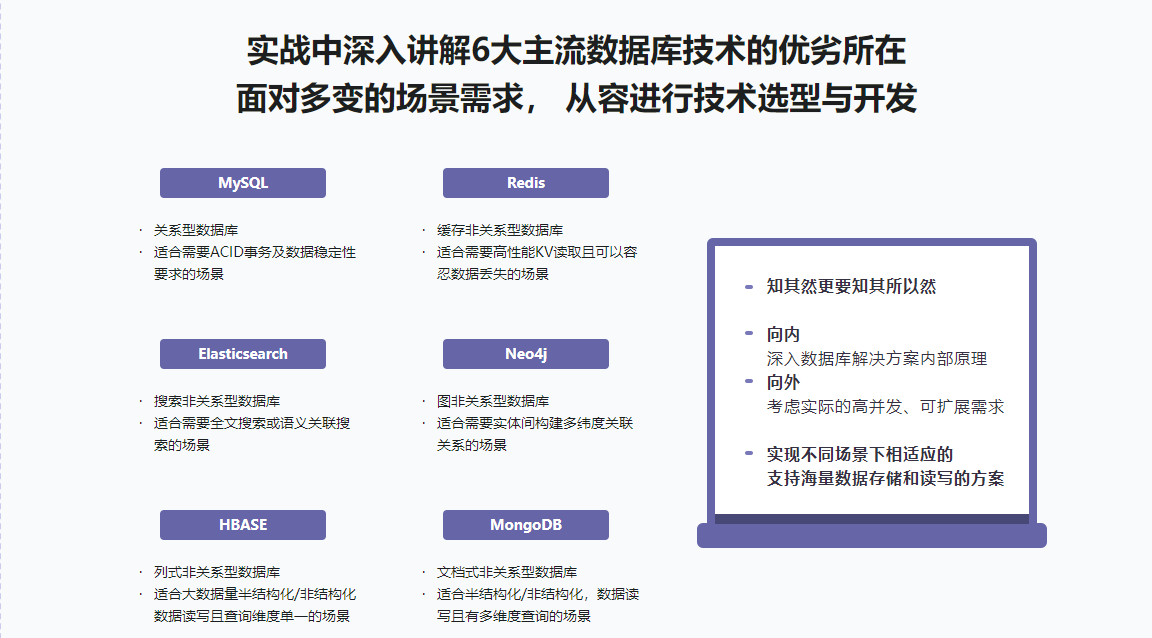 - 优秀的后端开发工程师,对于数据库存储方面,光会常规的CRUD已然不够,更需要懂各种数据库产品的优劣及适用场景,并能在适合的业务实践中准确选取合适的产品并应用。本课程利用一个社交新零售项目,带你学习如何基于不同的业务场景侧重的模式选择合适的数据库,并使用合适的设计形式,提升项目质量。