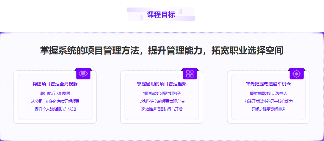 项目管理无处不在,它不仅仅是一个岗位,更是一套科学的工作方法,能够很好地指导我们的工作与生活。但很多开发者缺少项目管理意识与技巧,为自己的工作增添了许多额外的阻碍,不仅项目推进不及预期,也让个人职场发展受限。本课程带你系统性学习项目管理,让你不管做开发还是转PM,都能游刃有余!