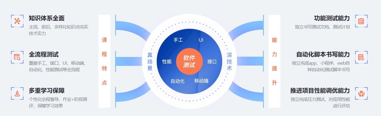 课程知识体系完备,从计算机基础,到功能测试,再到自动化测试,课程涵盖测试工具使用、测试原理讲解、自动化测试框架的实现等,同时覆盖多业务领域,如:电商、金融、小程序等
