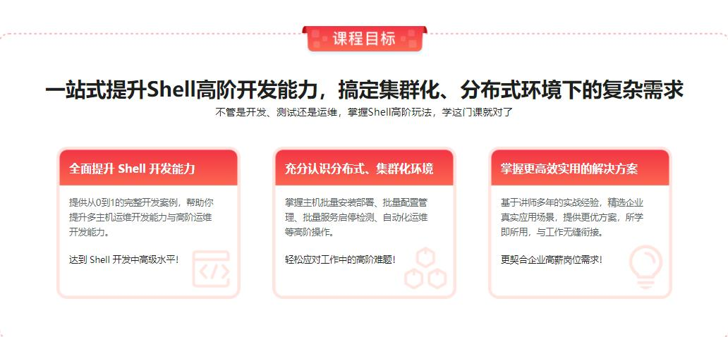 这是一门专为开发、测试及运维人员设计的 Shell 进阶实战课,结合讲师多年丰富的集群、分布式等复杂场景实战经验,带你系统掌握 Shell 高阶技能,让你能够轻松解决企业实际遇到的 Shell 相关开发与运维难题,早日成为更优秀的刚需人才!