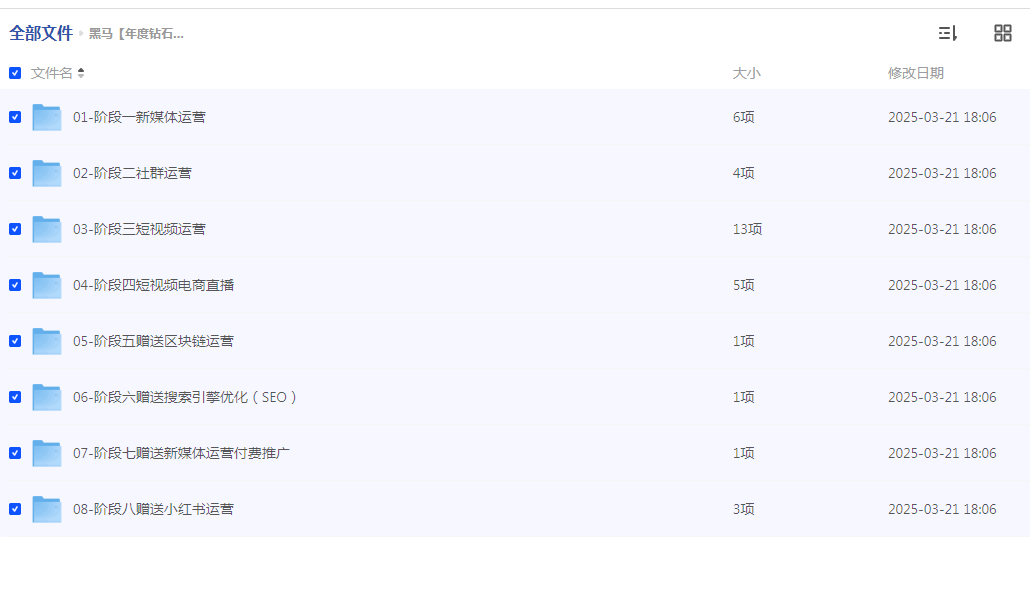 描述:黑马【年度钻石会员】新媒体+短视频直播运营课程是一个全面覆盖新媒体运营、短视频制作、直播运营及社群运营的综合性培训课程。